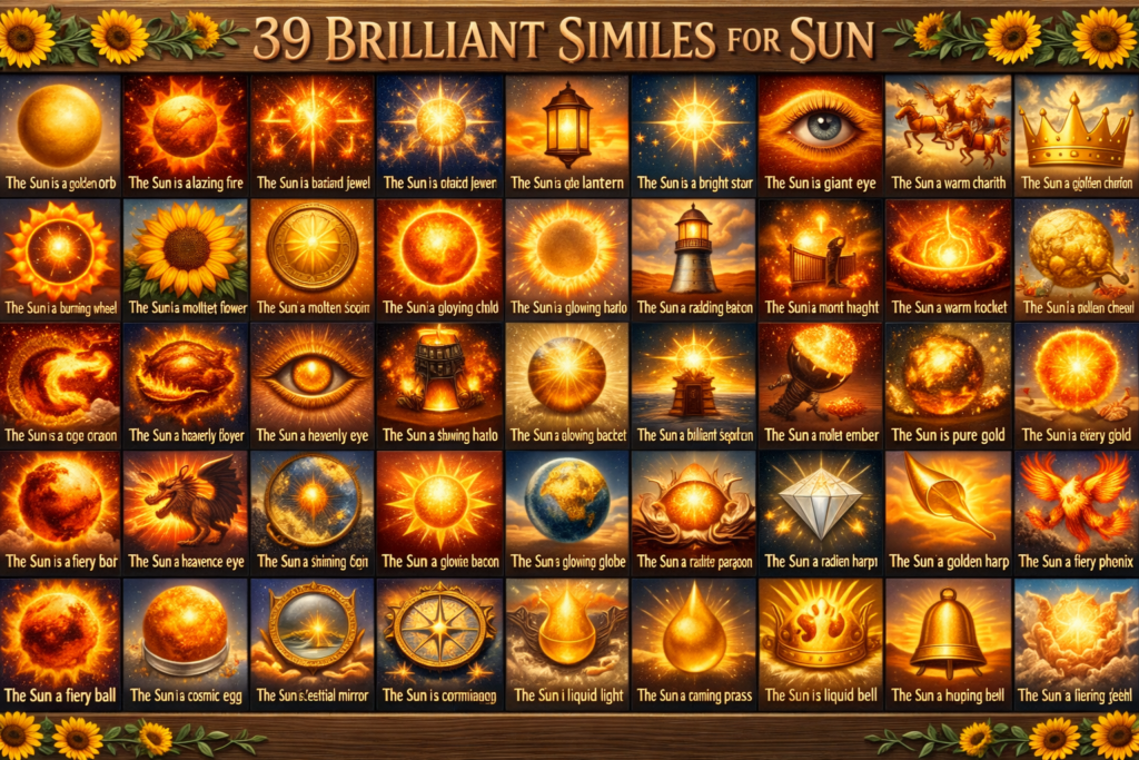 These 39 similes for sun provide creative and poetic ways to describe sunlight, warmth, sunrise, and sunset. Whether you’re writing poetry, travel blogs, or descriptive essays, these comparisons will bring your scenes to life.