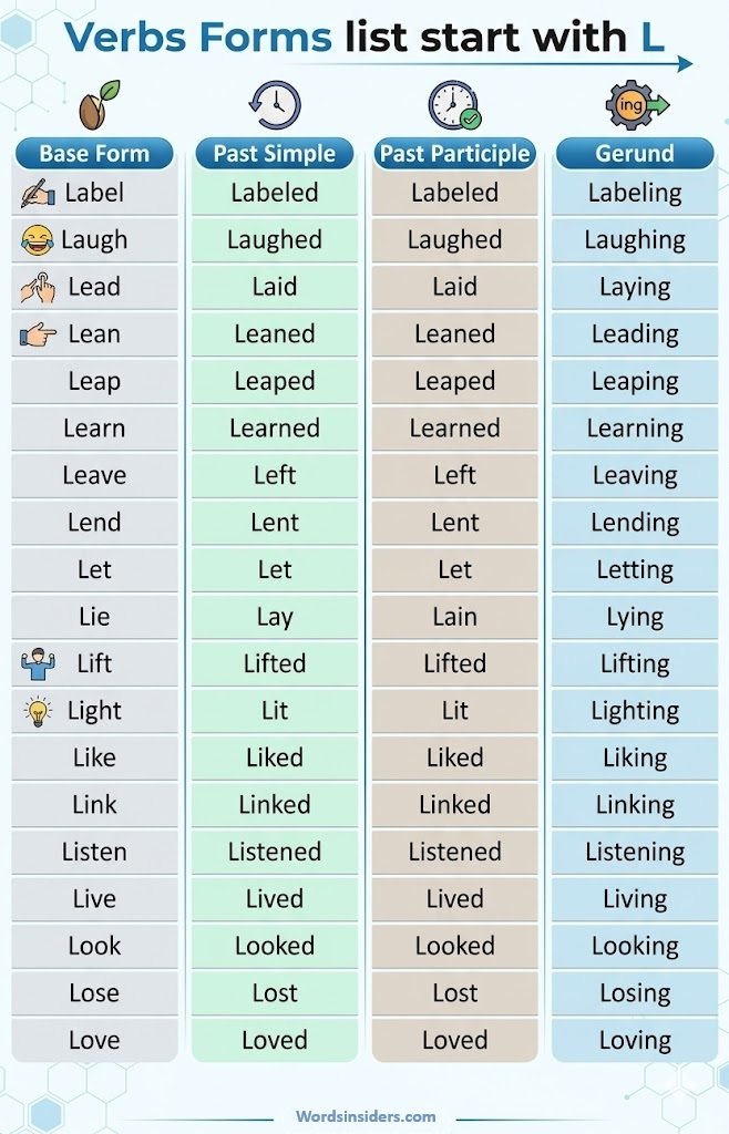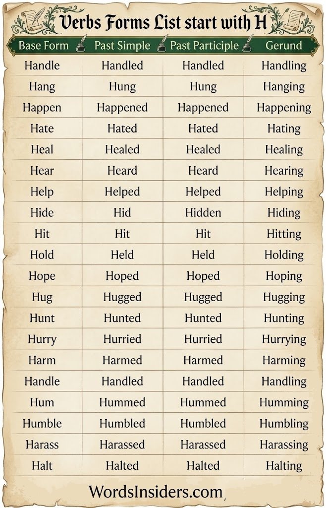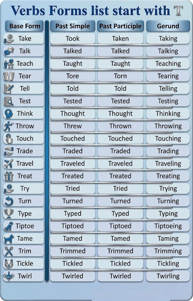 | Base Form (V1) | Past Simple (V2) | Past Participle (V3) | Gerund (V4) |