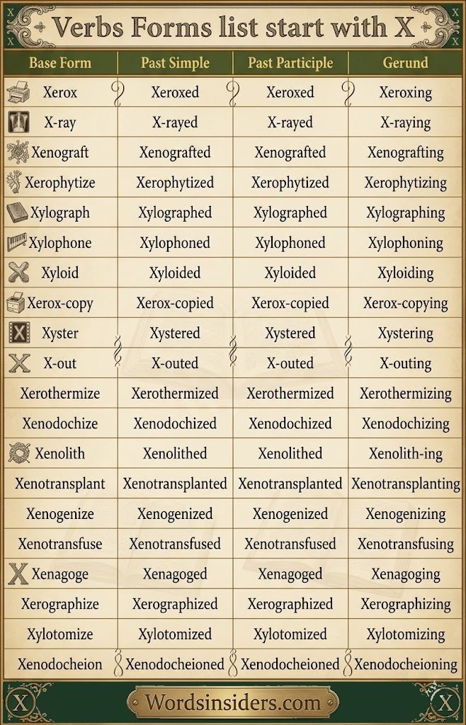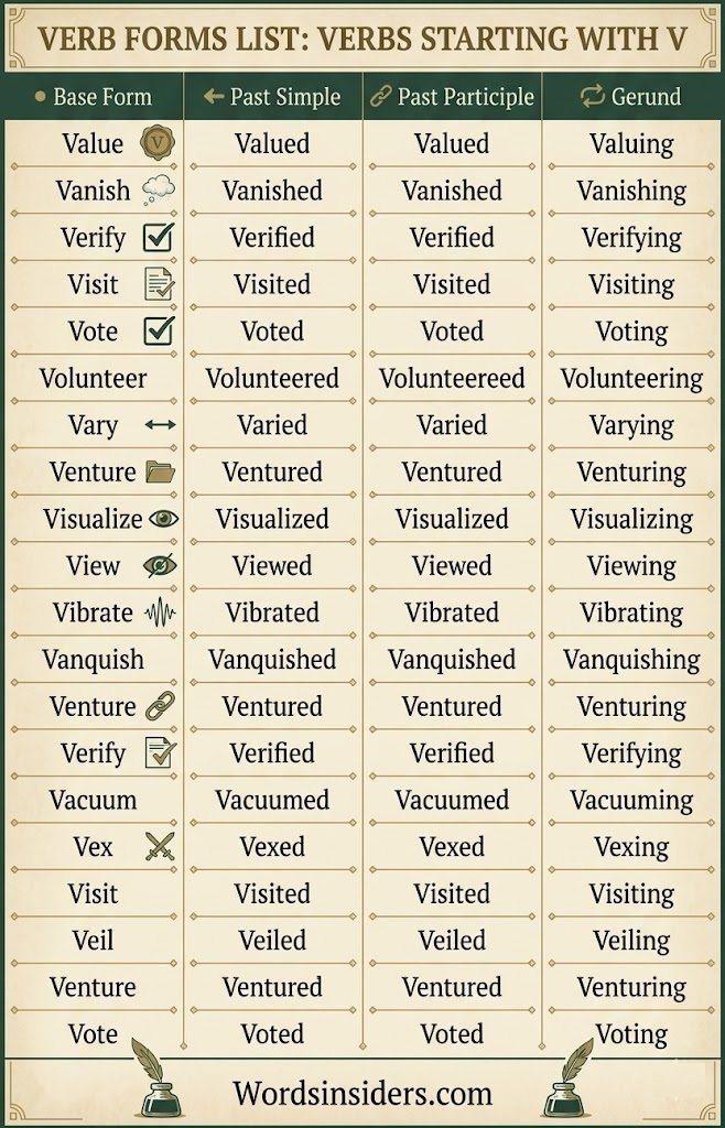 | V1 (Base Form) | V2 (Past Simple) | V3 (Past Participle) | Gerund V4 |